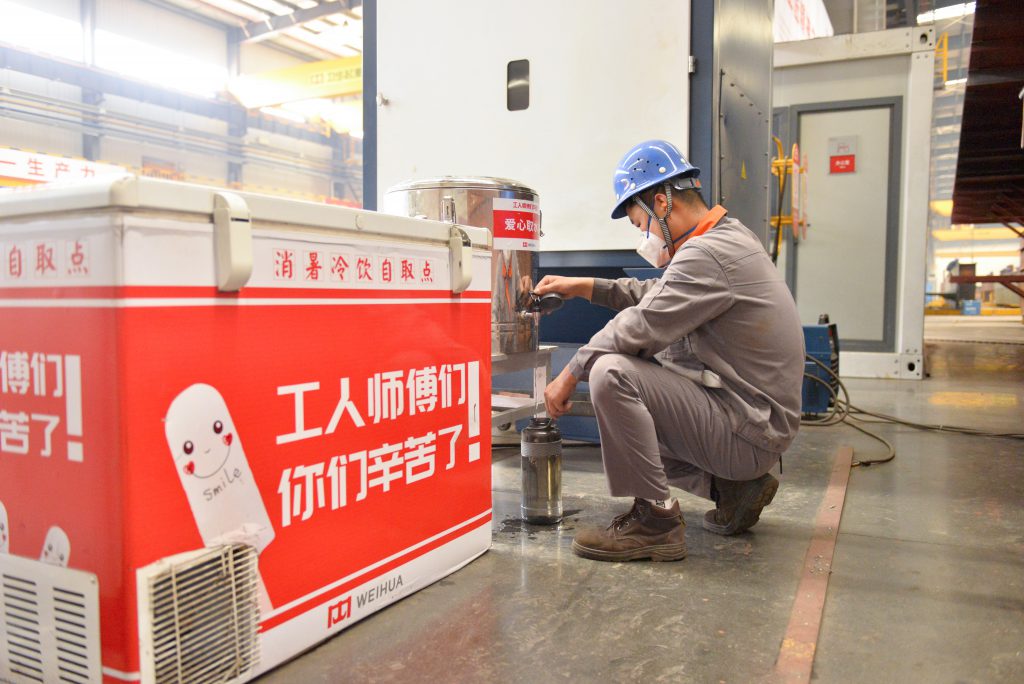 进入夏季以来,公司在车间及餐厅等地设置了多个冷冻冰柜,雪糕、矿泉水等冷饮无限量供应,此外,公司还为班组准备了藿香正气水、速效救心丸等防暑降温药品,以确保一线员工安全生产。