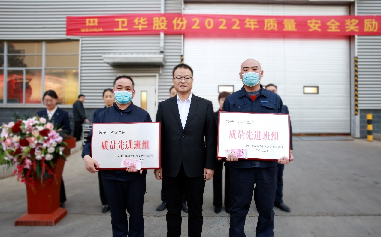 崔鹏和谢保华分别为质量先进班组和个人颁发奖金及荣誉证书